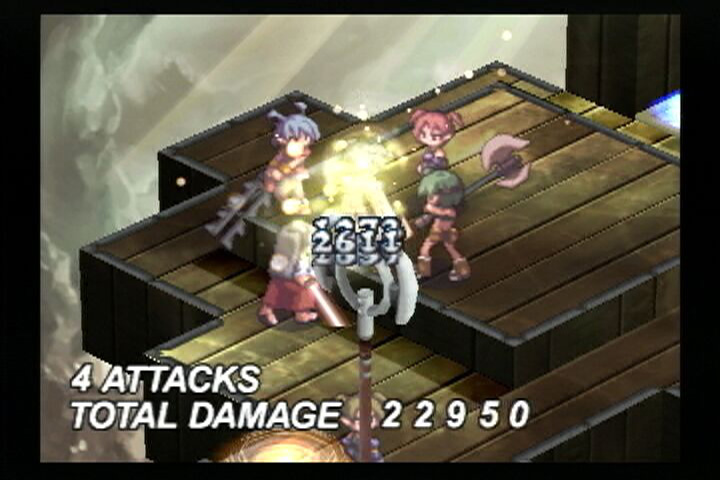 As has been said in reviews of other strategy/tactical RPGs, the strength of such games lies primarily in the battle system and related gameplay aspects (some of which were covered above). Disgaea packs as good a system as any of its TRPG rivals. It starts, of course, with the same ideas that are common in most TRPGs--each character has individual stats, including movement range, which they will be using to move over a grid. Each charcter gets one action and one movement per turn, which can be taken in whichever order the player wants. So at first glance, Disgaea looks to be nothing special. But after only a few battles, the game's individuality becomes undeniable. The first feature one will notice is the "Throw" command on the menu. This allows players to pick up either an ally or an enemy and launch them into a location more strategically fitting for their battle plan. Throwing enemies into each other and other obstacles will produce different results, adding alternate routes to victory (or defeat for that matter).