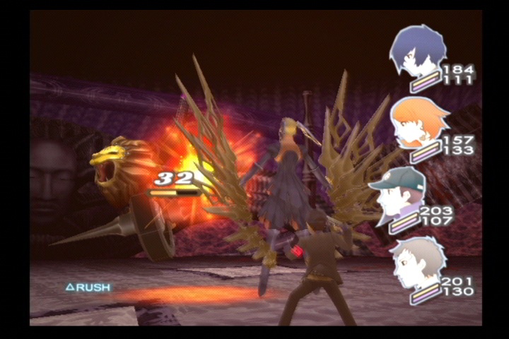 Battles are turn-based affairs; however, players only control the main character. This could bring doubt to some people's minds, but the AI for the other characters is superbly done. For example, once they find out an enemy is resistant to a spelltype, they don't use it any more, without players telling them not to. They also are great about healing other characters when needed. Anyway, the battles in Persona 3 have all the standard options, with the addition of Personae. The main character is capable of summoning different Personae, which essentially act both as his magic and as stat boosts. Depending on the Persona equipped, the main character will have different strengths and weaknesses. Furthermore, discovering and attacking the enemy's weakness is the key to victory. Hitting the enemy's weak point (for massive damage) will cause them to be downed, and set up the possibility of an All-Out Attack. These attacks essentially amount to a free ass-kicking session on the enemy, during which all the characters run in and hammer on the enemy for a short time. Because of this, players' strategies will almost certainly revolve around hitting weak points in the enemy's defenses. The battle system is highly strategic, and actually works very quickly. The challenge level is high, but not as high as some entries in the Shin Megami Tensei series, notably Nocturne.