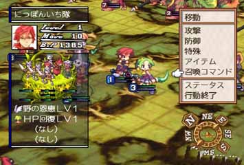 Soul Nomad and the World Eaters opens with the game world largely in disarray, thanks to three particularly nasty creatures, called the—you guessed it--"World Eaters," and the demon forces that controlled them two hundred years back. Their commander has been sealed away, but the World Eaters are sitting dormant in the world, posing an obvious threat. In some sort of sealed village, the hero, whose gender the player selects at the start of the game, is training for battle. The idyllic lifestyle is short-lived as he is called to wield an Onyx Blade that contains the spirit of Gig, badguy supreme. The hero is apparently the only one who can possibly contain Gig's spirit without getting consumed. Even then, Gig is constantly trying to lend the hero more of his power, which will slowly destroy the hero's soul and leave behind a body for Gig to ravage the world in. In and out of battle, Gig approaches with all kinds of offers for dark power of smiting, many of which are dotted with a telltale "Bad Ending" symbol. The story holds some promise and is complemented by a script that is more serious and less humorous than previous Nippon Ichi games--not to mention more crass.