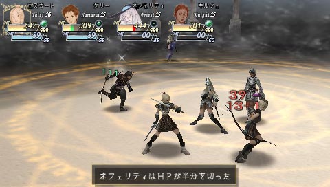 What makes the combat itself better is the class system behind it. Each character has a primary "job" or "class," the variety of which will be familiar to RPG veterans. After developing a primary, the player can change a character's class and still retain the skills learned while performing that particular job; in a nice touch, there is also no stat change or penalty for changing classes. When progressing, only character's prime job will receive level growth. By now, this should sound very familiar to players of Final Fantasy V and/or certain MMORPGs. Valhalla Knights is different, though, in that it allows characters to use two subclasses instead of one (which is the more common case in RPGs that have such a system).